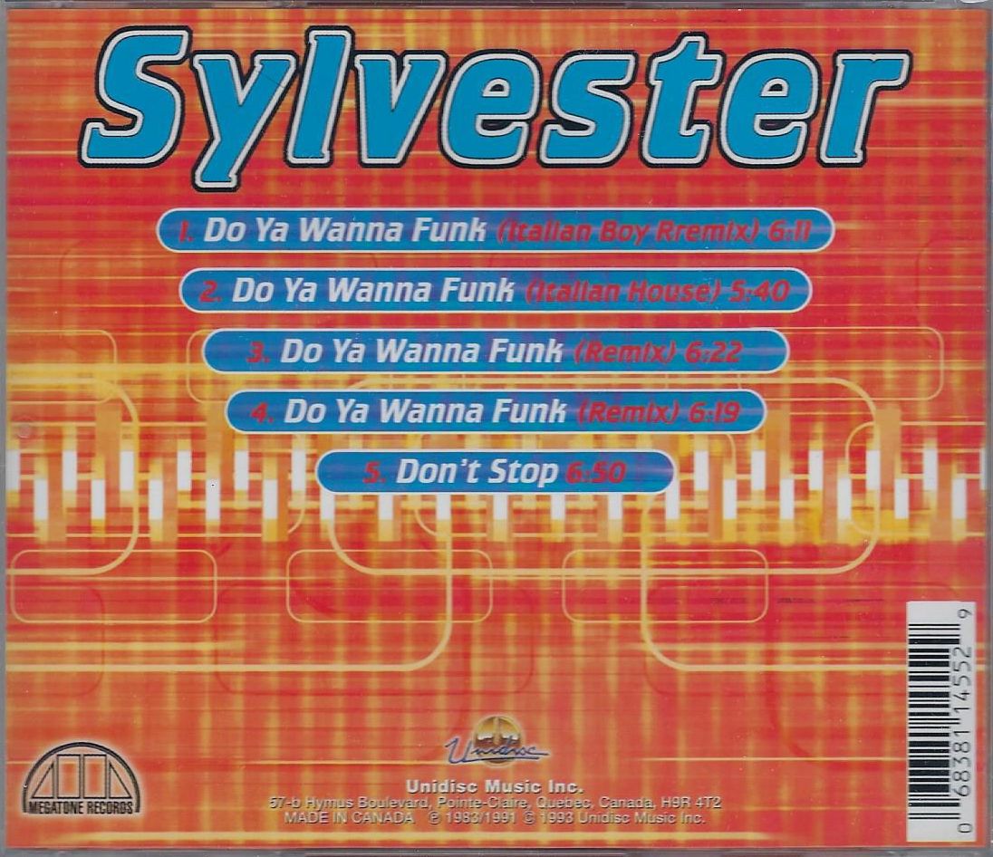 Sylvester – Do Ya Wanna Funk / Don't Stop. 1 Do Ya Wanna Funk (Italian Boy Remix) Remix – DJ Herbie, Easy B 6:11. 2 Do Ya Wanna Funk (Italian House) Remix – DJ Herbie, Easy B 5:40 3 Do Ya Wanna Funk (Remix) Remix – Joseph Watt 6:22 4 Do Ya Wanna Funk (Remix) Remix – Joseph Watt 6:19 5 Don't Stop 6:50 Label: Unidisc/Megatone – SP5-1455 Barcode - 068381145529 Cd = in normale cd album jewelcase. Verzendkosten : Als normale cd. Import From Canada If you want to order this great album and live outsidee the Netherlands, no problem. We shipped worldwide en paypments can be done isn $, GBP & Euro by Paypal. Ask for the right post & shipping amount. Send e-mail to info@dubman.eu