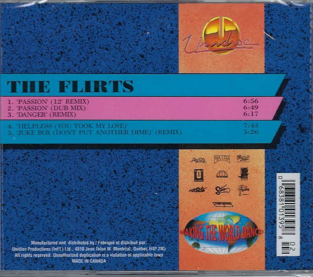 MAXI CD Single. The Flirts – Passion / Danger / Helpless (You Took My Love) / Jukebox (Don't Put Another Dime). 1 Passion (12" Remix) 6:56 2 Passion (Dub Mix) 6:49 3 Danger (Remix) 6:17 4 Helpless (You Took My Love) 7:43 5 Jukebox (Don't Put Another Dime) (Remix) 5:26 Label: Unidisc/Megatone – SP5-1395 Barcode - 068381013958 Cd = in normale cd album jewelcase. Verzendkosten : Als normale cd. Import From Canada If you want to order this great album and live outsidee the Netherlands, no problem. We shipped worldwide en paypments can be done isn $, GBP & Euro by Paypal. Ask for the right post & shipping amount. Send e-mail to info@dubman.eu